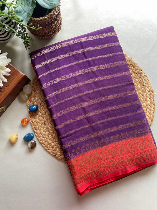 Purple n Red Stripes Banarasi Pure Crepe Georgette Saree