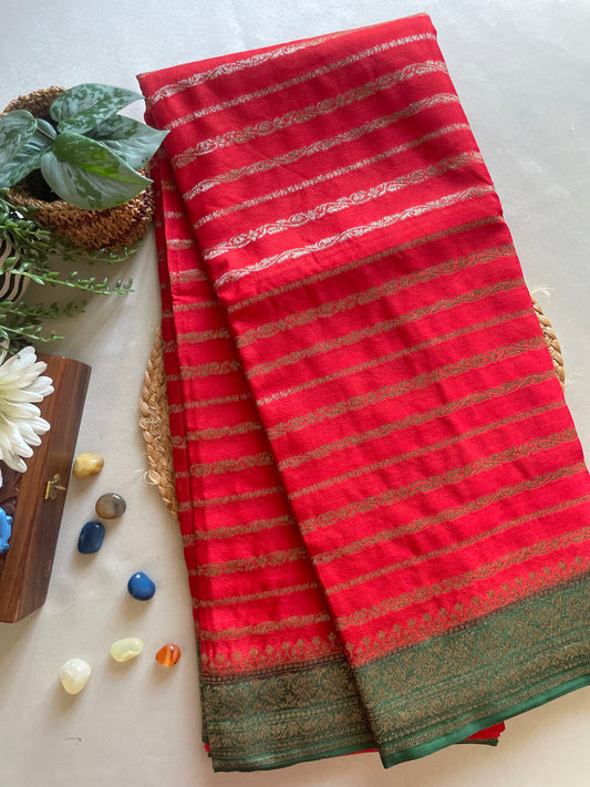 Red n Green Stripes Banarasi Pure Crepe Georgette Saree