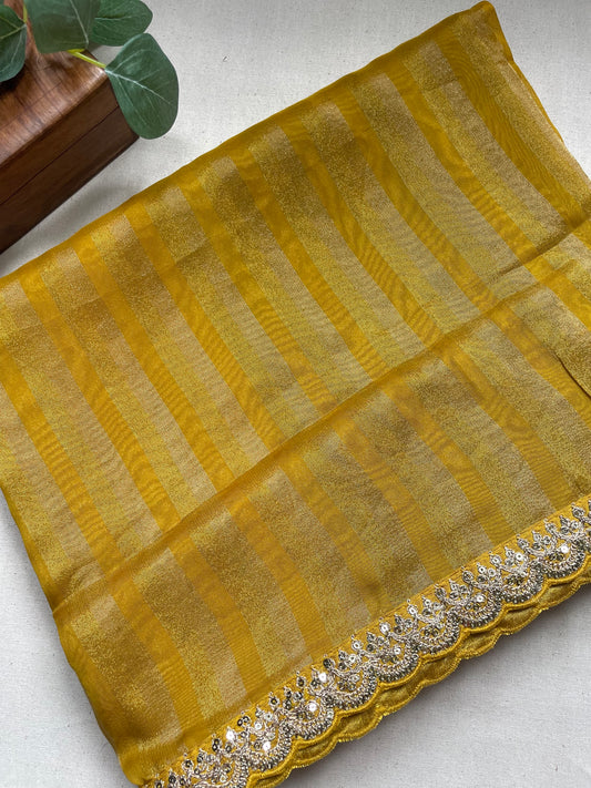 Yellow Stripe Lace border Tissue Saree