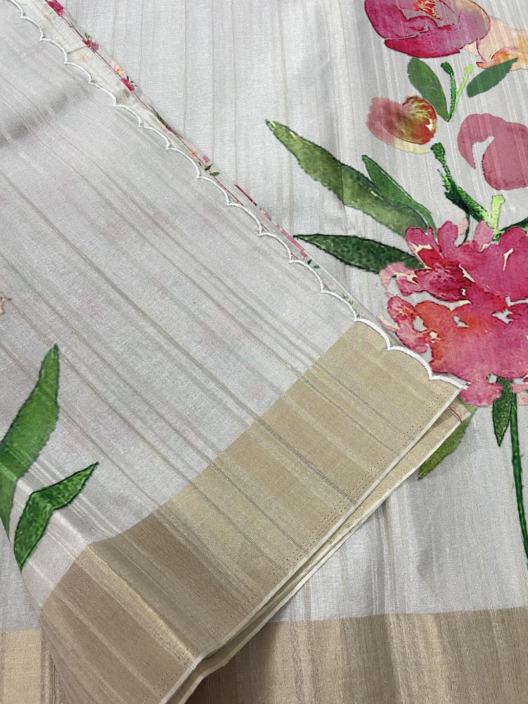 White Floral Printed Semi Tussar Saree